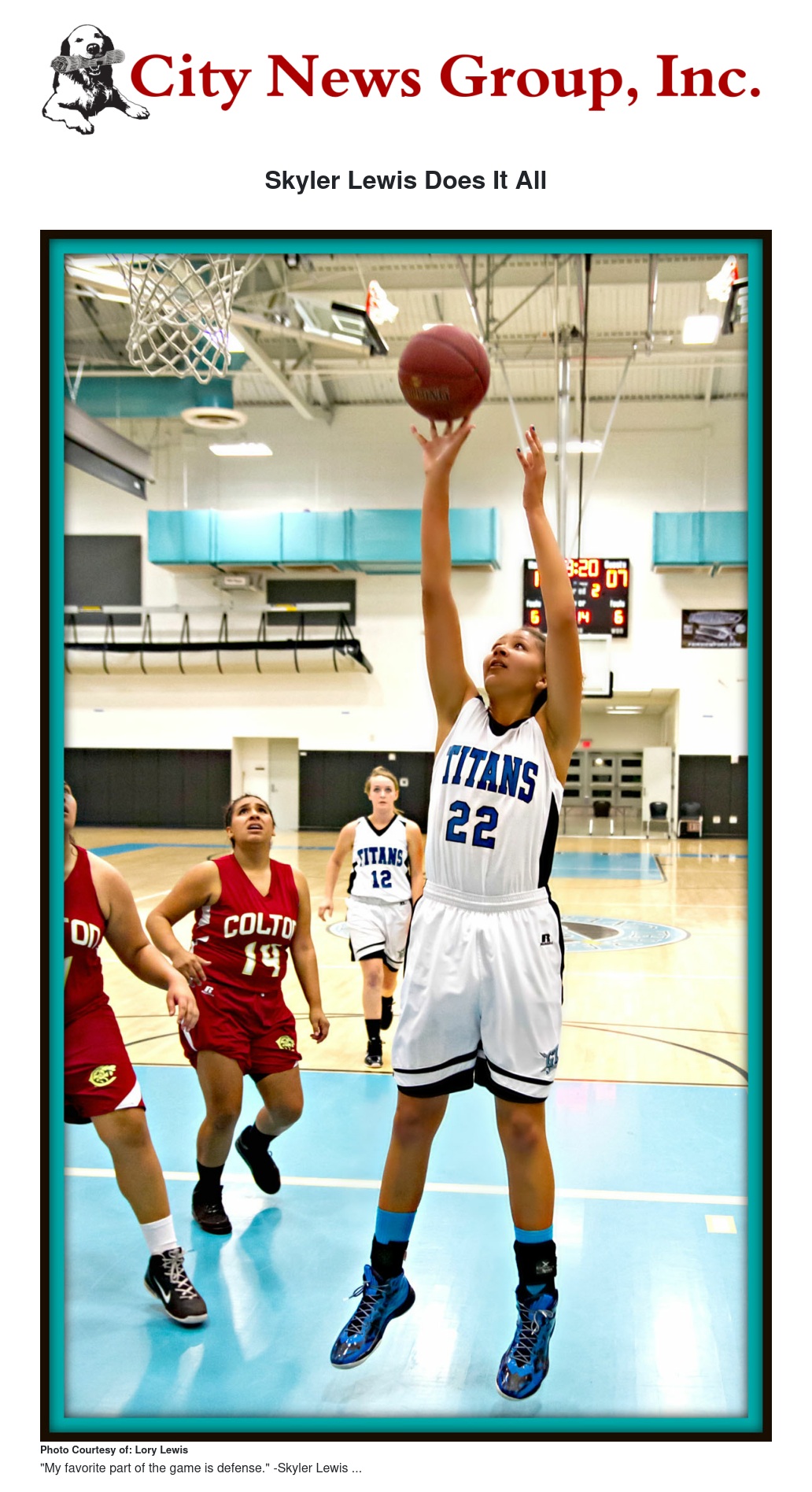 Grand Terrace High School's Coach Johnny Vazquez had nothing but good things to say about 15-year-old basketball star, Skyler Lewis. Vasquez describes Lewis as "very mature, unselfish and humble for being only 15 years old, and her teammates love her and respect her."