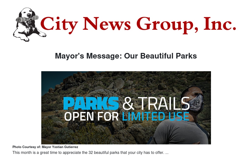 Moreno Valley’s beautiful parks are open on a limited basis during the heightened coronavirus restrictions. While high-touch facilities like playgrounds and picnic tables are closed for now, all open spaces and trails are available with appropriate distancing and masks. Please visit Parks & Community Services online at www.moval.org/parks-comm-svc for more information, and your local park for some well-deserved exercise and relaxation.