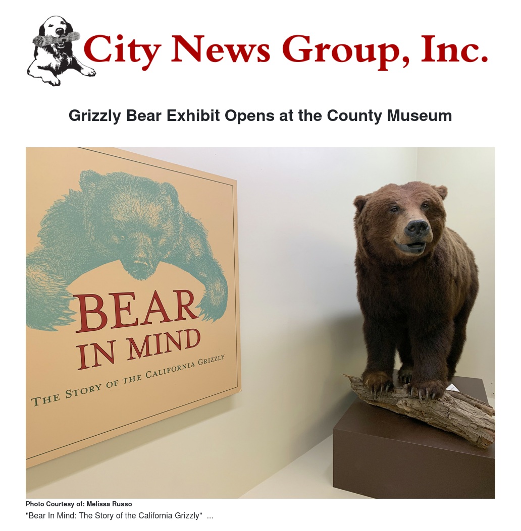 Over the centuries, the relationship that Californians have had with the grizzly bear is one of dualities - expressed in fear and fascination. Although extinct in the state since the early 20th century, the grizzly has long been a central character in California's history. Illuminating the story of the grizzly is the exhibition "Bear In Mind: The Story of the California Grizzly" which opened at the San Bernardino County Museum on Oct. 1, and runs through Nov 24.