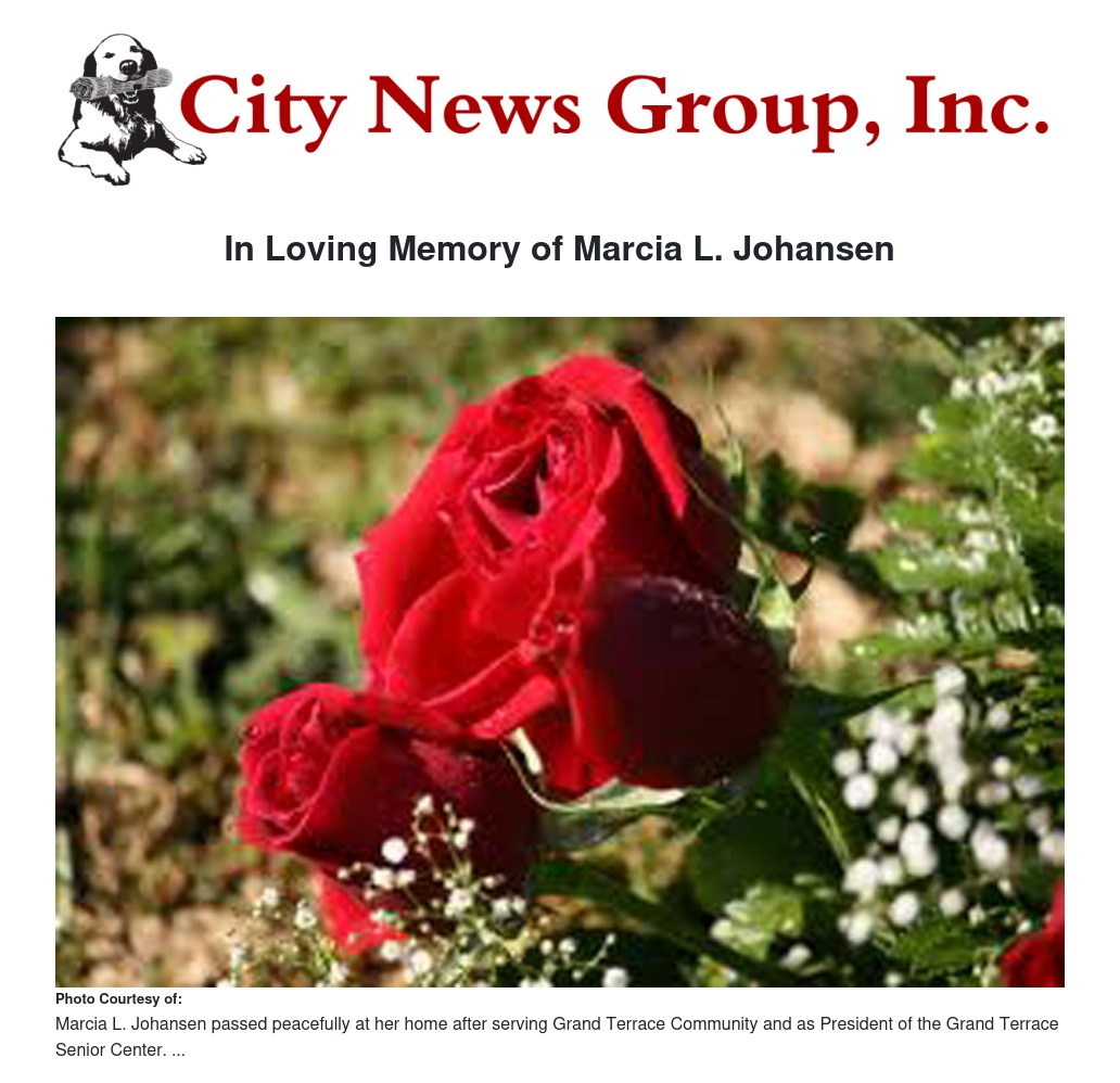 Marcia then focused her skills and tireless perseverance to establishing the Senior Center in Grand Terrace. She was recognized for her organization of senior services and activities which lead to the first Senior Center built in Grand Terrace, where she served as president for several years.