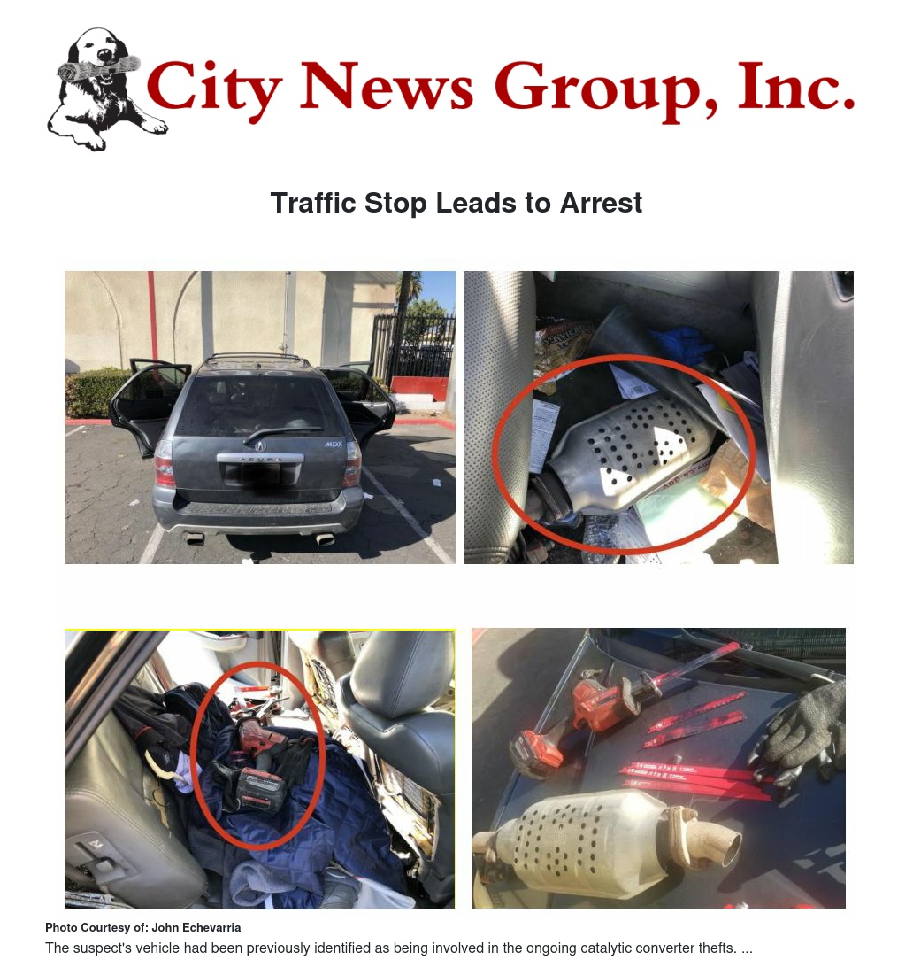 San Bernardino Police Officers conducted a traffic stop on a 2005 Acura MDX while patrolling our city. The driver Mark Anthony Arrnerogalvan (DOB 06-18-1991), was observed to have committed multiple vehicle code violations. He was also found to have an outstanding DUI arrest warrant and a suspended driver’s license. During a search of the vehicle, a catalytic converter that appeared to have been freshly cut was located. San Bernardino District Crimes Detectives responded to the scene and conducted the main investigation. Arrnerogalvan’s vehicle had been previously identified as being involved in the ongoing catalytic converter thefts. Arrnerogalvan was transported to the San Bernardino Police Station, where he was formally interviewed, and admitted to his involvement in catalytic converter theft. Arrnerogalvan acknowledged that he knew the catalytic converter located in his vehicle was recently stolen. Arrnerogalvan was transported to the San Bernardino County Central Detention Center, where he was booked and lodged for his outstanding warrant and receiving stolen property. The investigation is still ongoing; if you have any additional information which can help solve this or other crimes, or you would like to speak with an investigator, please contact Detective R. Whitmer (909) 384-5668 whitmer_ro@sbcity.org or Sgt. M. Aranda at (909) 384-5642 or aranda_ma@sbcity.org.