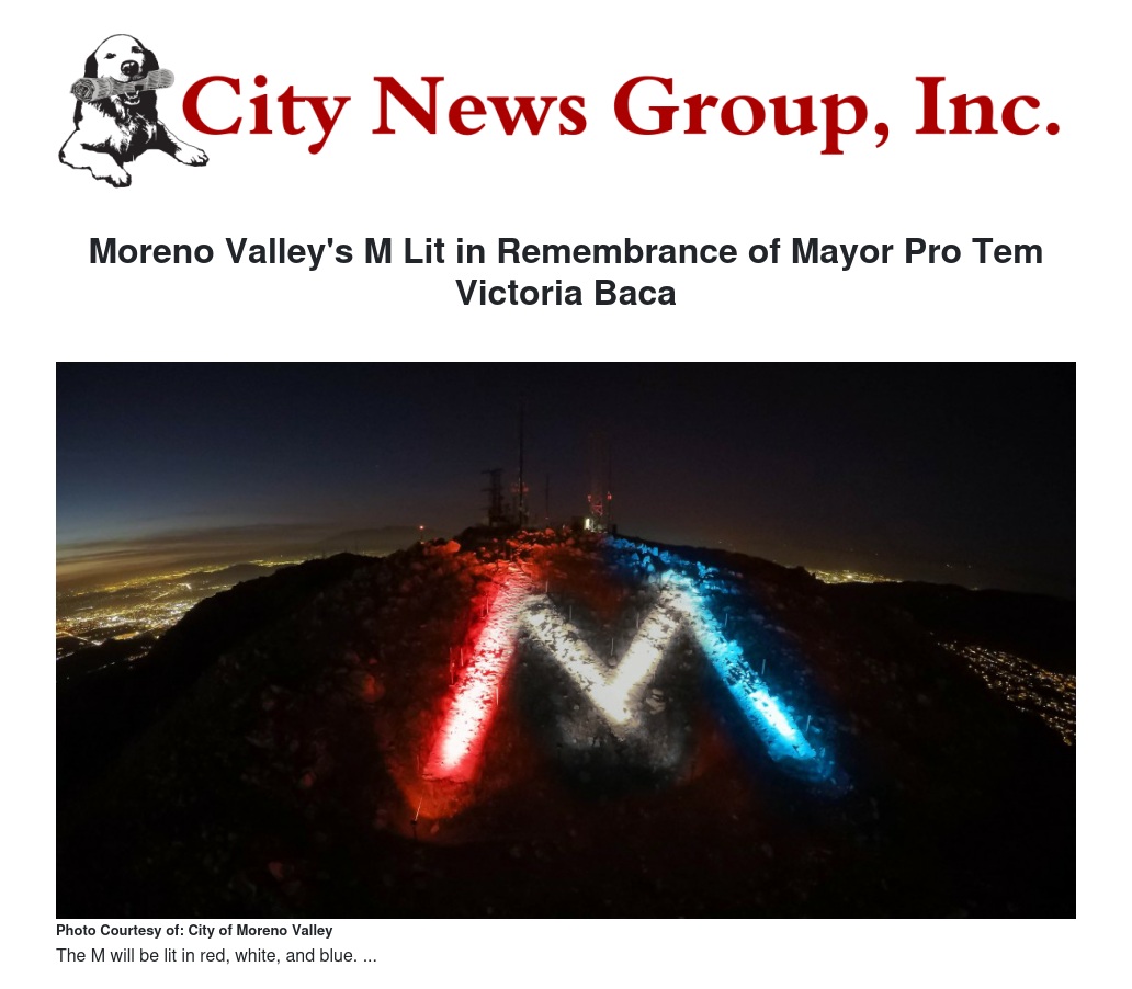 Moreno Valley's M Lit in Remembrance of Mayor Pro Tem Victoria Baca by City of Moreno Valley - City News Group, Inc.