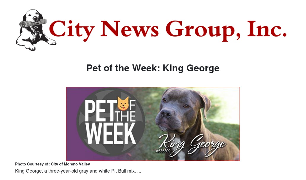 If you would like to make King George or any pet from the Moreno Valley Animal Shelter part of your family, please contact the Moreno Valley Animal Shelter at 951.413.3790 or visit www.moval.org/pets.