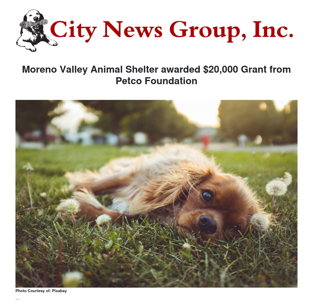 Moreno Valley Animal Shelter awarded $20,000 Grant from Petco Foundation by Ariel Dun - City News Group, Inc.