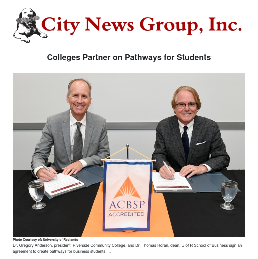 “This agreement reinforces the strong partnership between Riverside City College and University of Redlands.  It also builds upon our shared commitment to provide seamless pathways to our students to further their education” said Dr. Gregory Anderson, president of Riverside City College. “Additionally, this agreement recognizes excellence, as both of our institutions have earned accreditation by the Accrediting Council of Business Schools and Programs (ACBSP).”