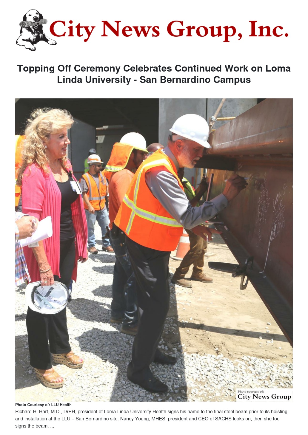 On Friday, July 31, Loma Linda University Health held an intimate “Topping Off” ceremony, celebrating the completion of the concrete steel structure of Loma Linda University - San Bernardino. An informal beam-signing ceremony occurred prior to the final beam’s installation into the main structure. Loma Linda University - San Bernardino, 250 South “G” Street in San Bernardino, across from 66ers Stadium.