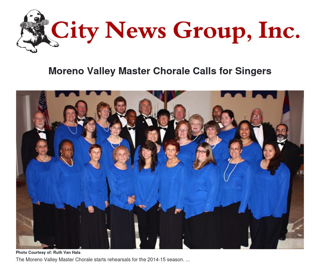 The Moreno Valley Master Chorale is calling all singers to join the Chorale for the 2014-15 season.