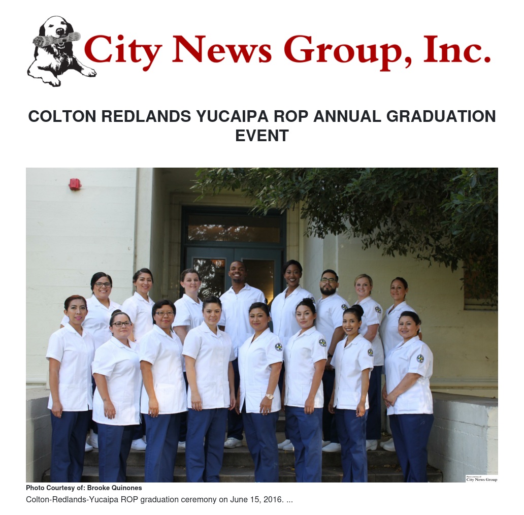 Redlands, CA.--The Colton-Redlands-Yucaipa Regional Occupational Program (CRY-ROP) conducted its annual graduation for their adult students on Wednesday, June 15, 2016, at 6:00 p.m. at the Redlands High School’s, Clock Auditorium, Redlands CA. Approximately 35 program graduates, 17 High School Equivalency achievers and their families, the Governing Board, instructors and staff members gathered to acknowledge and celebrate the completion of career training programs in various medical fields as well as those participants who have earned their High School Equivalency during the 2015-2016 academic year. Speakers included Patty Holohan, Vice President of the CRY-ROP board, Clifton Washington, High School Equivalency Achiever and Stephanie Houston, CRY-ROP Superintendent.