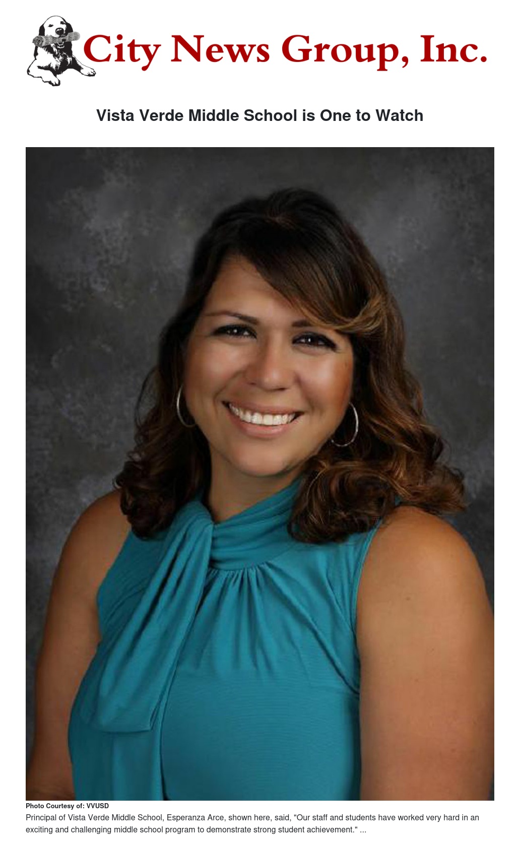 Vista Verde Middle School serves 6th to 8th grade students in Val Verde District. California’s Schools to Watch-Taking Center Stage program uses a competitive, rigorous review process to identify high performing, high impact middle schools so that all middle schools may have models of real-world success. Vista Verde Middle School is one of just of 59 model schools that have been identified statewide since 2003.