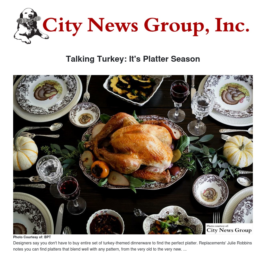 Designers say you don't have to buy entire set of turkey-themed dinnerware to find the perfect platter. Replacements' Julie Robbins notes you can find platters that blend well with any pattern, from the very old to the very new.