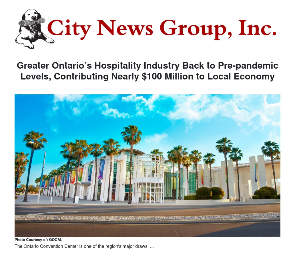 Greater Ontario’s Hospitality Industry Back to Pre-pandemic Levels, Contributing Nearly $100 Million to Local Economy by Steve Lambert - City News Group, Inc.