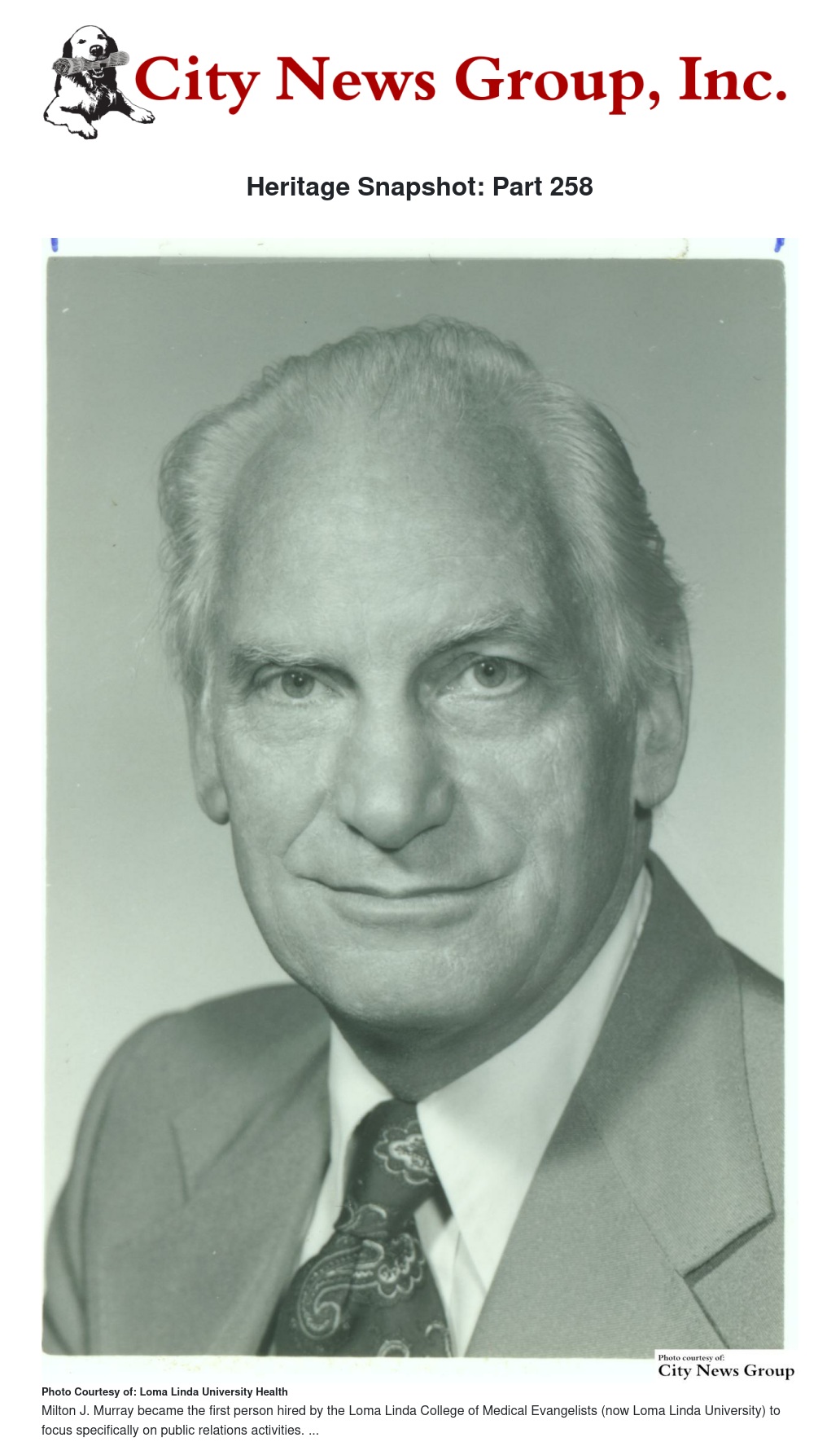 In 1949, Milton J. Murray became the first person hired by the Loma Linda College of Medical Evangelists (now Loma Linda University) to focus specifically on public relations activities. His interest in public relations started soon after being honorably discharged from the United States Army on October 31, 1945, when he became a linotype operator at the Ketchikan Chronicle, in Alaska. The job opened his eyes to a new profession.