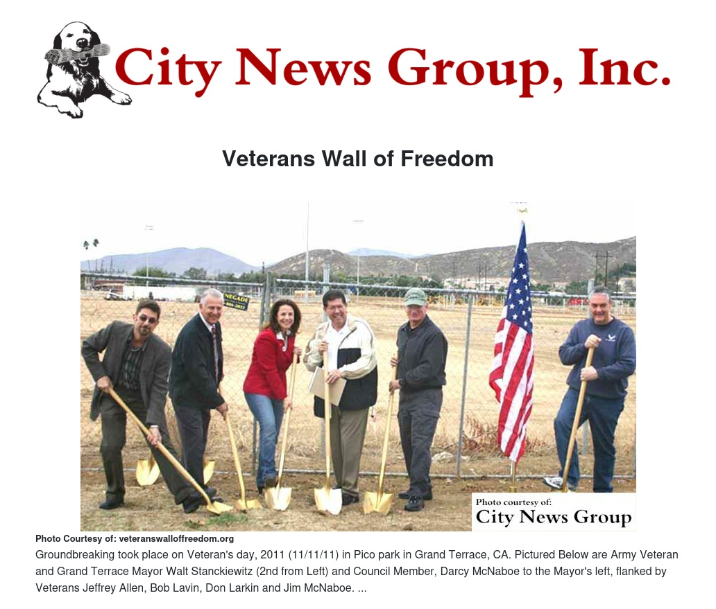 For information on the Veterans Wall of Freedom, including a complete list of all the sponsors of this project, browse to VeteransWallofFreedom.org, or contact Jim McNaboe at Jim@McNaboe.net or 909-709-2611. The Veterans Wall of Freedom project is a committee of the Foundation of Grand Terrace (501(c)3).