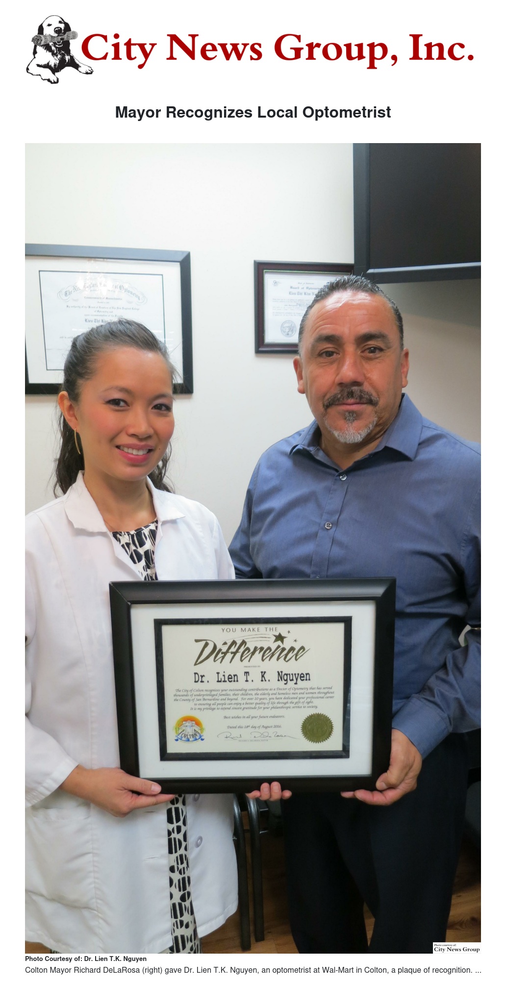 COLTON>> Colton Mayor Richard DeLaRosa visited Dr. Lien T.K. Nguyen at her optometry office in Wal-Mart in Colton Aug.18 to present to a plaque for recognition for the work she has done as an optometrist.