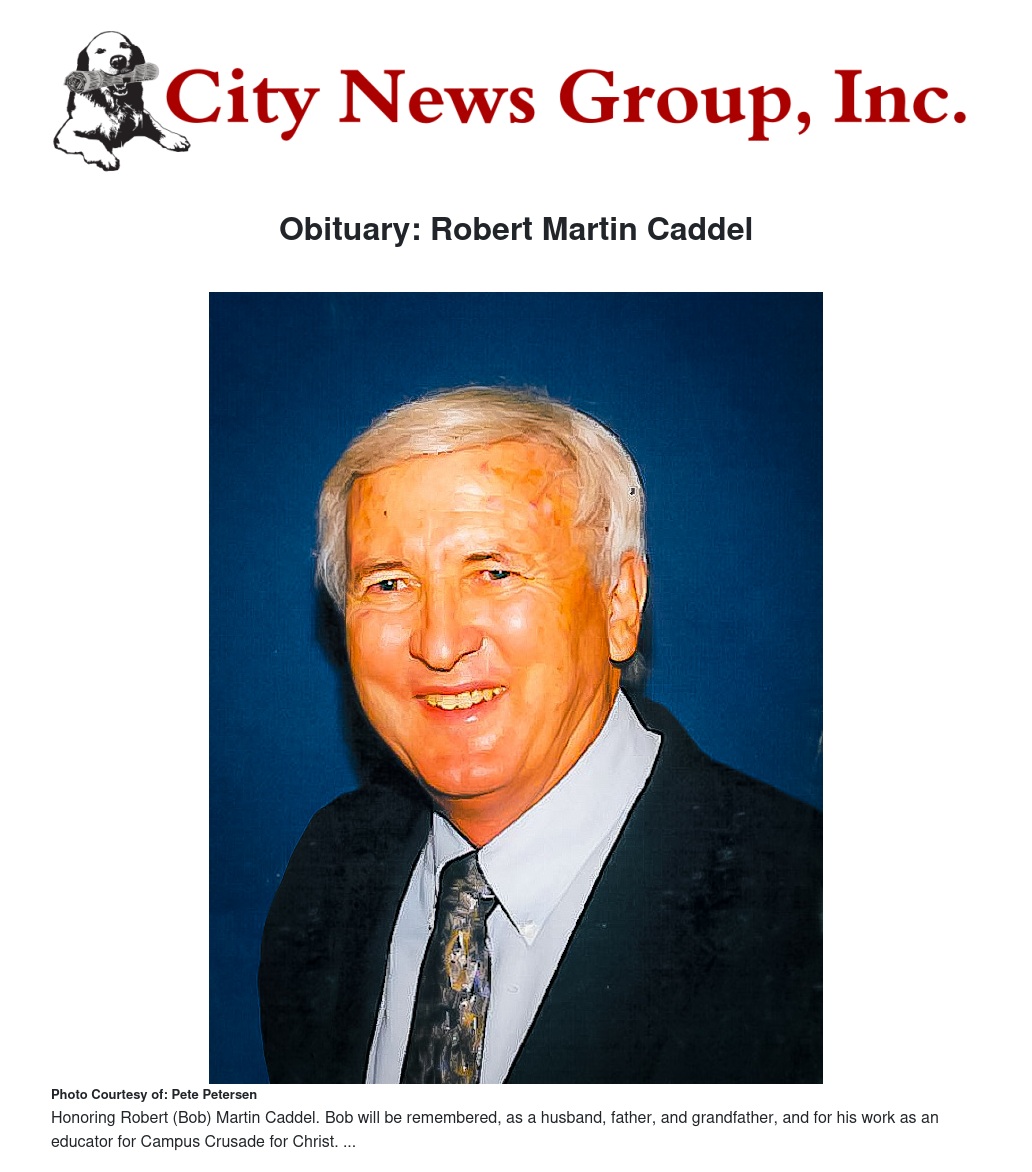 Robert (Bob) Martin Caddel, age 86 of San Bernardino, CA went to be with his Lord on August 3, 2022. He was preceded in death by his parents and is survived by his loving wife, Sandy, and their five children, eight grandchildren, and one great-granddaughter.