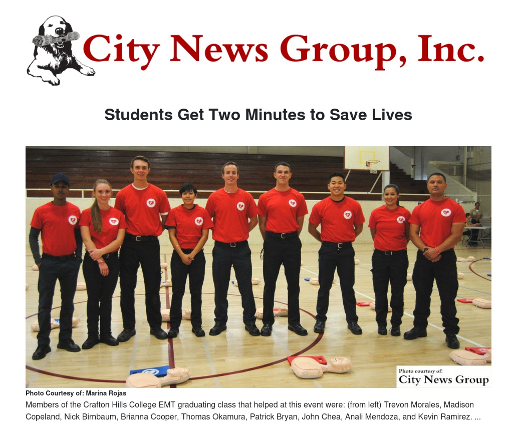 The Stayin’ Alive song played as students entered the gym and received instruction. As they began to practice the Compression only techniques under the watchful eye of Crafton Hills College (CHC) and College of the Desert (COD) EMT program interns, it was explained that the song runs at 100 beats a minute, which is the perfect rate for the timing of the compressions needed to keep someone ‘stayin’ alive’ in the event of Sudden Cardiac Arrest.