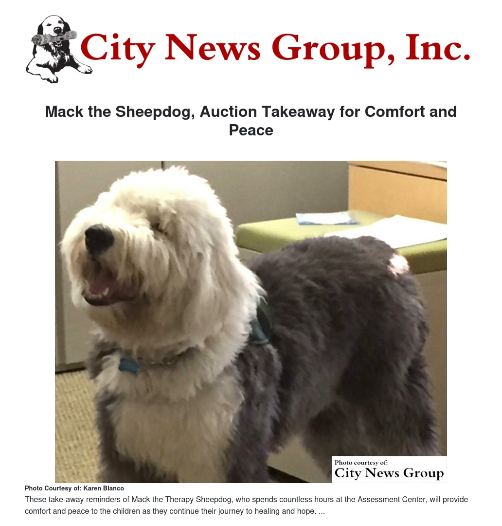 These take-away reminders of Mack the Therapy Sheepdog, who spends countless hours at the Assessment Center, will provide comfort and peace to the children as they continue their journey to healing and hope.