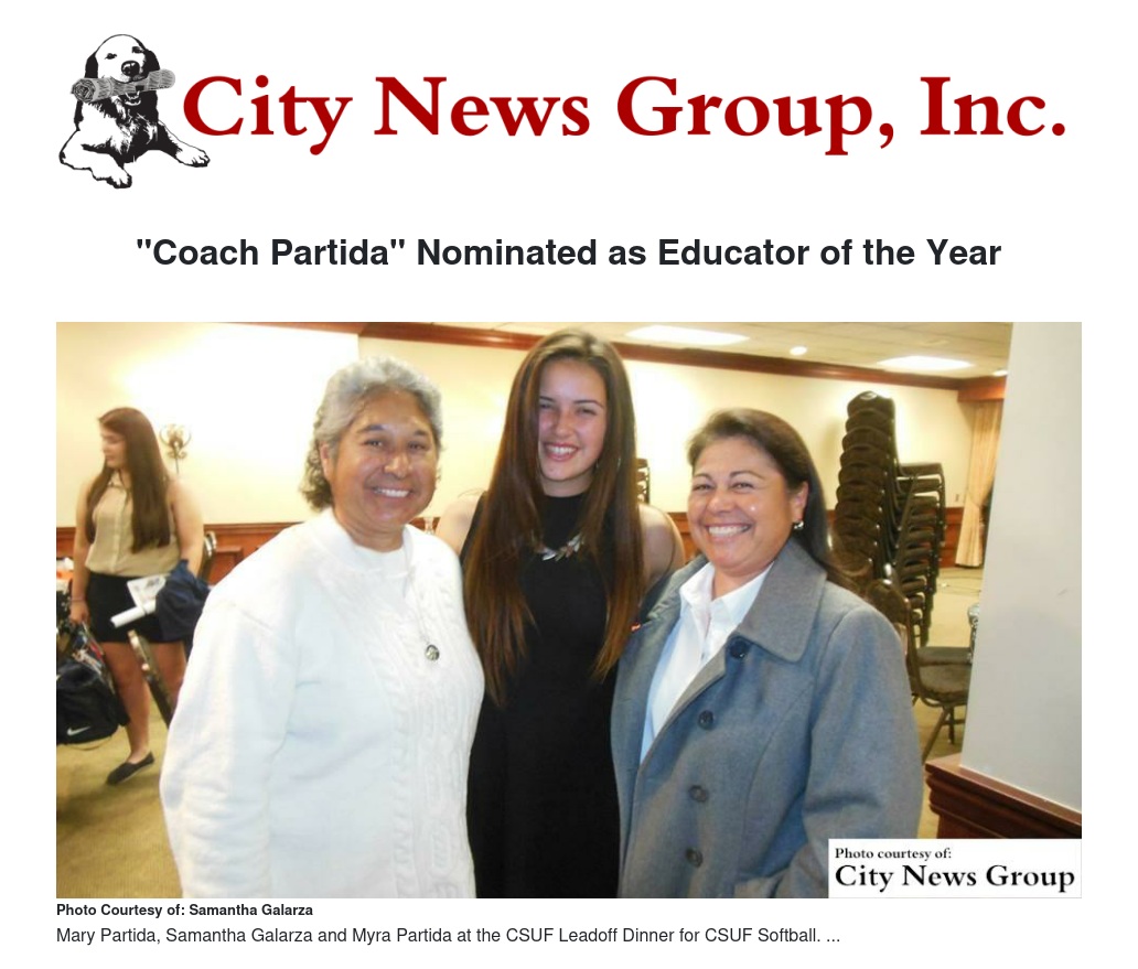 Another past student, Samantha Galarza, who has known Coach Partida for seven years, says "I like to think of Coach Partida as an angel sent from heaven, rather than just a coach. She teaches through example and lives the life that she would want others to live. Through words I can never express how much I appreciate her; whether it's through her encouragement in the bad times or acknowledge the good, she is always there. We talk almost day. She sends me her daily quotes every morning, and its a great way to start my day." Galarza was the recipient of a full-ride scholarship to Cal State Fullerton, where she is now a junior; an accomplishment that she believes Coach Partida's influence played a large role in helping her reach.