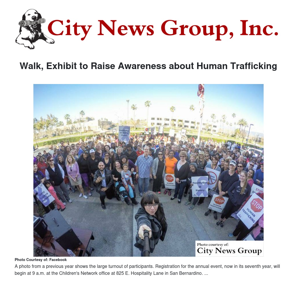 ALL>> San Bernardino County Coalition Against Sexual Exploitation will draw attention to the crime of commercial sexual exploitation and trafficking one step at a time as the coalition will host its 2017 Human Trafficking Awareness Walk on Saturday, Jan. 28 in San Bernardino.