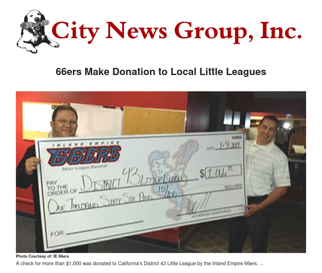 The Inland Empire 66ers recently made a donation to area little leagues.