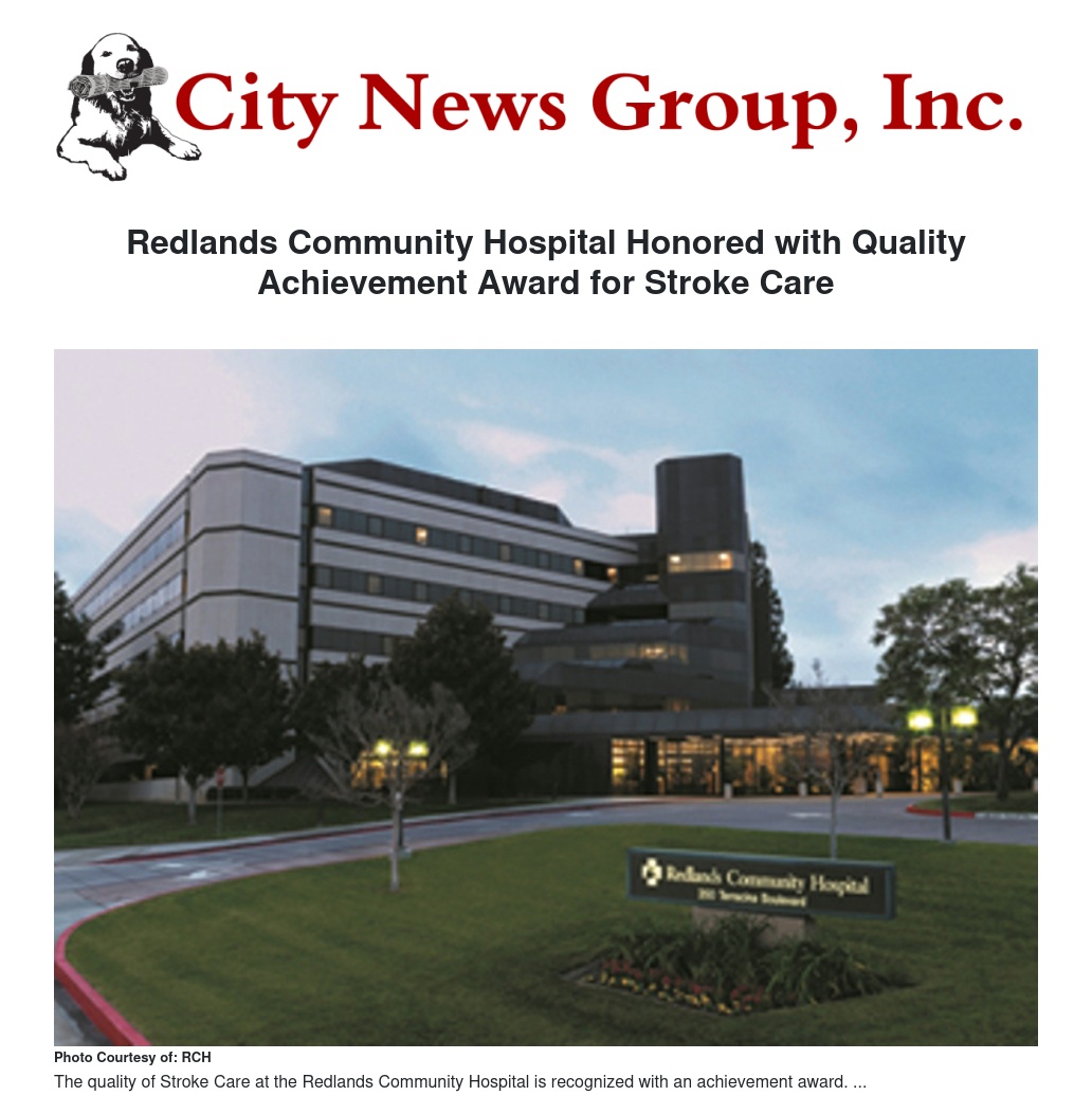 Redlands Community Hospital has received the Get With The Guidelines R-Stroke Silver-Plus Quality Achievement Award for implementing specific quality improvement measures outlined by the American Heart Association/American Stroke Association for the treatment of stroke patients.
