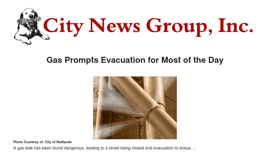 The leak was reported shortly after 9:30 a.m. when a Verizon crew working in an underground vault on Cajon Street between Fern and Cypress avenues detected flammable gas in the vault and called the Redlands Fire Department. Fire personnel detected high levels of flammable gas in the underground vaults along Cajon from Fern to Highland. Redlands Police closed Cajon to traffic from Olive Avenue to Highland Avenue.