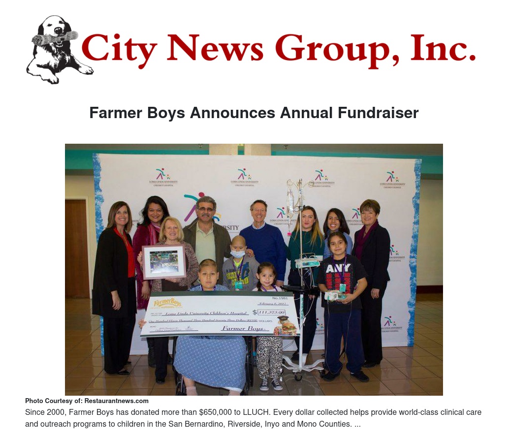 “For 17 rewarding years we have partnered with LLUCH to help fundraise for such an important organization with the help of our generous guests,” said Larry Rusinko, vice president and chief marketing officer for Farmer Boys. “Every year we look forward to hosting this annual fundraiser where 100% of the donations collected support medical care for 1.2 million children in Southern California.”