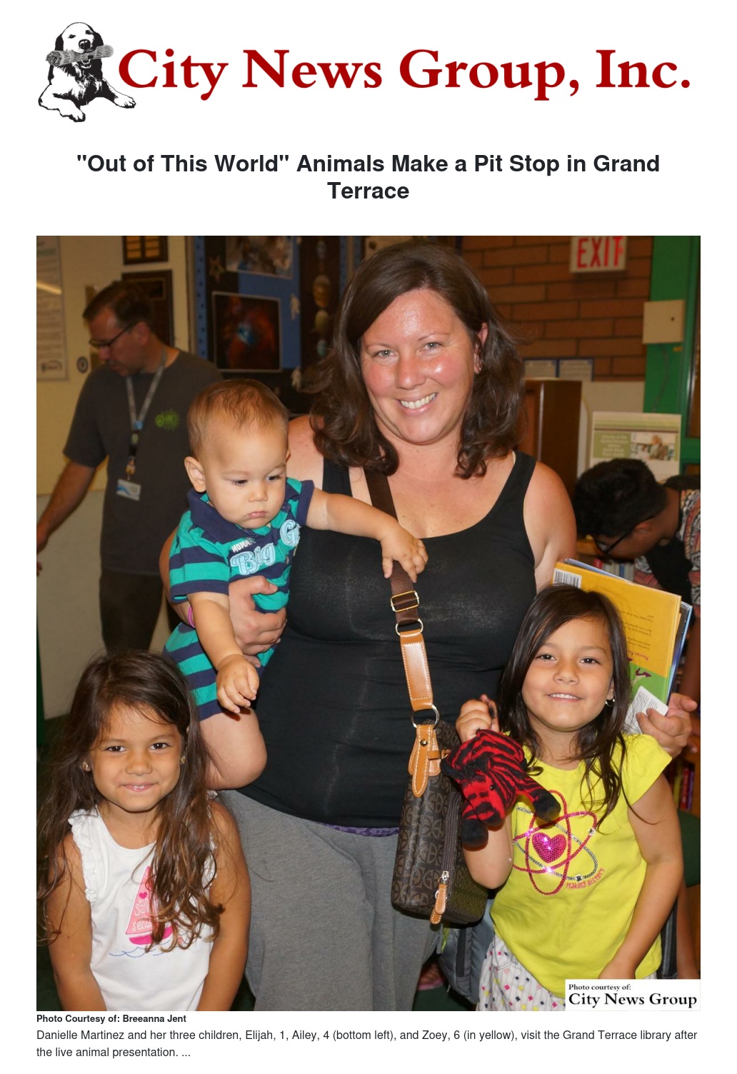 The Friends of the Grand Terrace Library welcomed dozens of young guests and their parents to Pacific Animal Productions' "Out of This World Animals" presentation, part of the statewide Summer Reading Program, where they got a first-hand look at a diverse range of exotic animals.