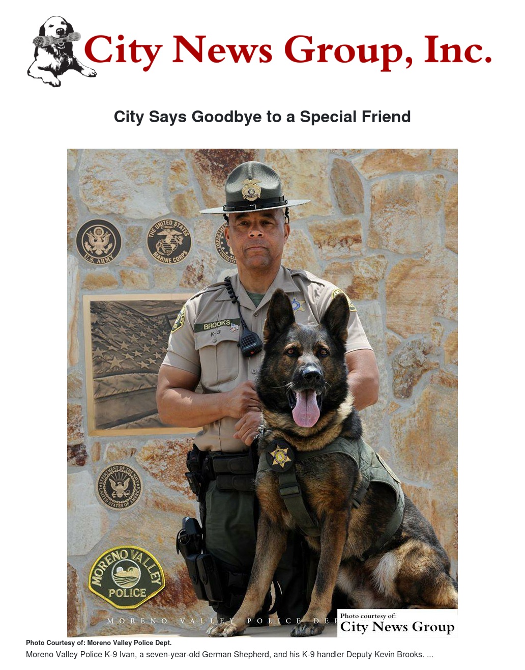 "Brooks was not only Ivan’s working partner, but his best friend. The two were inseparable whether fighting crime or conducting demonstrations for residents. Ivan was the City of Moreno Valley’s most active community relations dog, appearing at dozens of City events, school presentations and parades," the release states. "He and Brooks were the unofficial ambassadors of Moreno Valley. But Ivan wasn’t all show. He was an excellent police service dog with numerous felony suspect apprehensions and seizures of illicit street drugs."