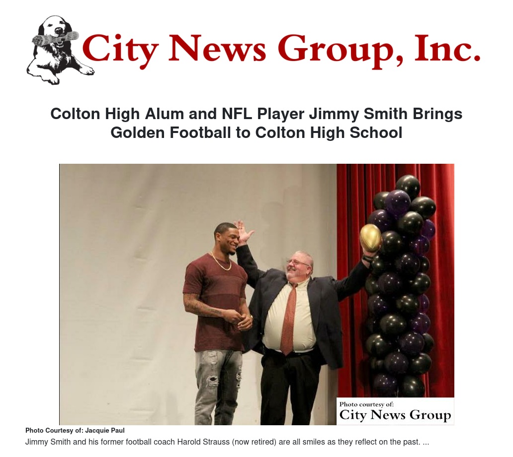 Colton High Alum and NFL Player Jimmy Smith Brings Golden Football to Colton High School