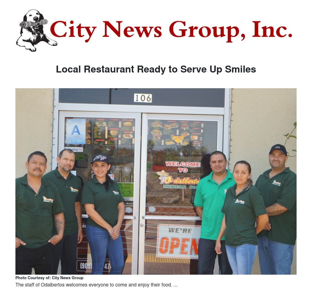 Odalberto’s Mexican Food restaurant staff are ready to provide its customers the best eating experience through friendly customer service and good food. Being the first Odalbertos to open in Grand Terrace, it is already becoming a hot spot to to the community. So, if you're looking for fresh and delicious food, a family friendly environment, and affordable prices, come and stop into Odalbertos! You'll be sure to be welcomed with a smile by staff, have a great food experience, and leave happy and full.