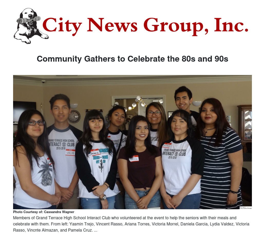Additionally in attendance were members of Grand Terrace High School Interact Club who were volunteering at the event to help the seniors with their meals, socialize, and clean-up. Members in attendance included:
