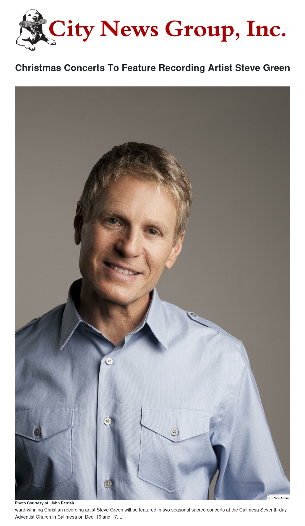 ALL>> Award-winning Christian recording artist Steve Green will be featured in two seasonal sacred concerts in Calimesa on Dec. 16 and 17.