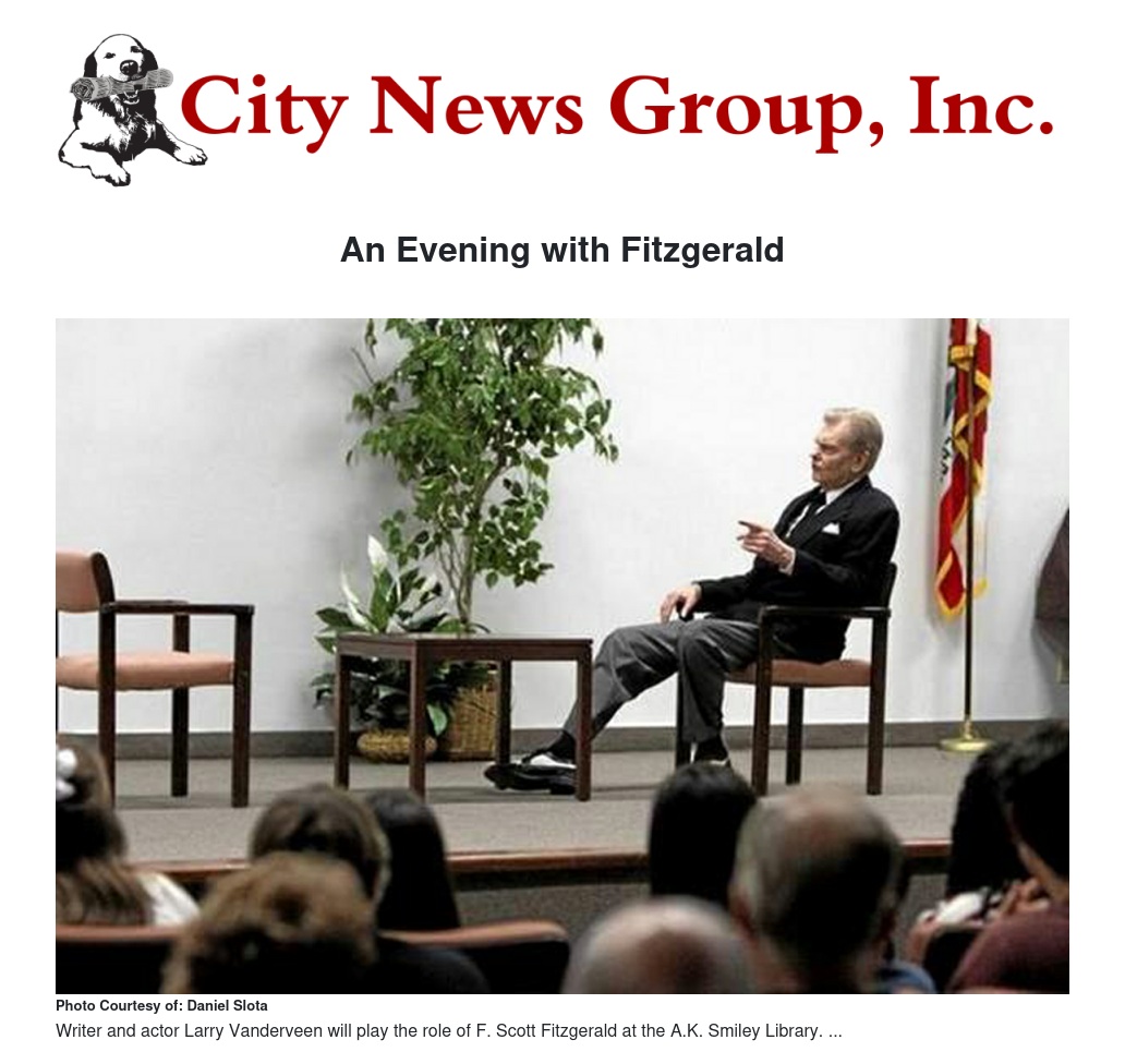 The A.K. Smiley Library presents an evening with F. Scott Fitzgerald. On Sunday, Sept. 28 actor and writer Larry Vanderveen assumes the role of legendary novelist F. Scott Fitzgerald in a powerhouse one-man show exploring the life and times of the man who penned such classic American novels as The Great Gatsby and This Side of Paradise.