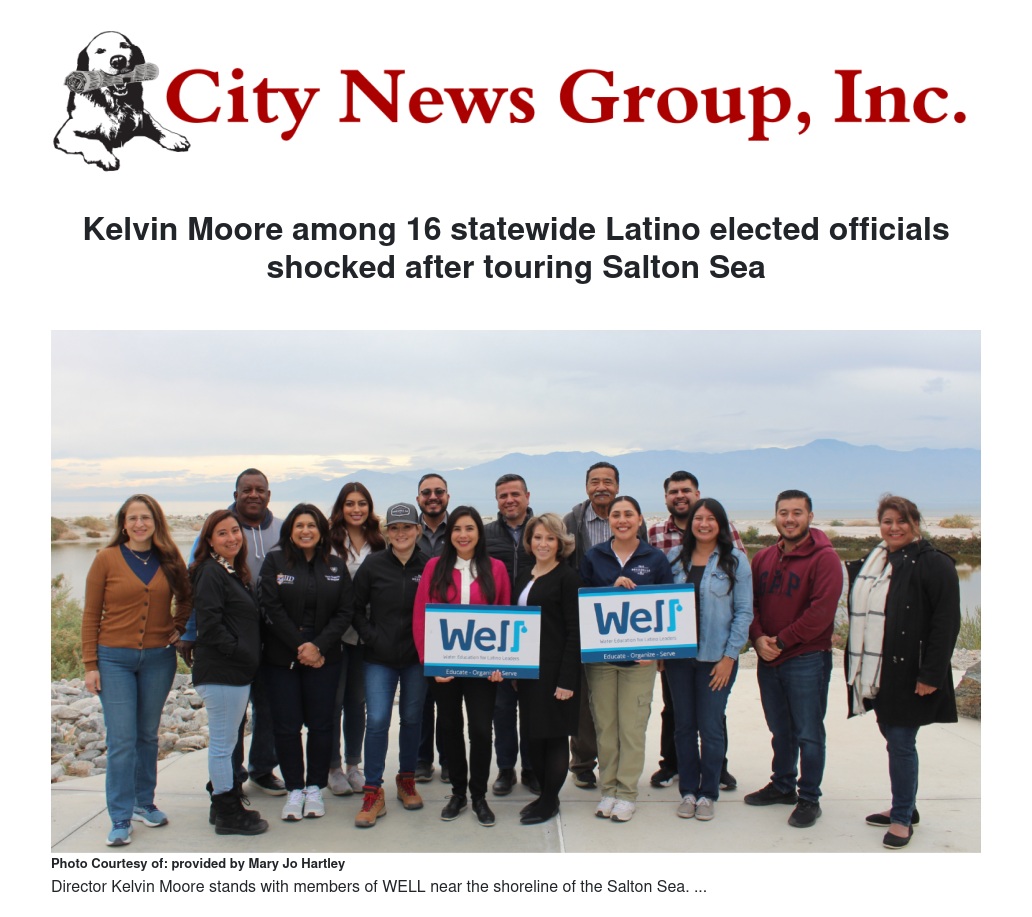 San Bernardino County, West Valley Water District Director Kelvin Moore was shocked to see the impacts of Salton Sea contamination on the nearby community after his group of 16 local Latinoelected officials from across California toured the Salton Sea on January 20. They witnessed thepolluted and shrinking body of water while inhaling the same arsenic and selenium—the smell of hydrogen sulfide (rotten egg stench)—plaguing the area's farm workers and other low-wage families. After walking along the shoreline, the public officials who belong to WaterEducation for Latino Leaders (WELL) questioned Salton Sea Authority Executive Director G.Patrick O’Dowd over severe challenges to the local ecosystem and residents.
