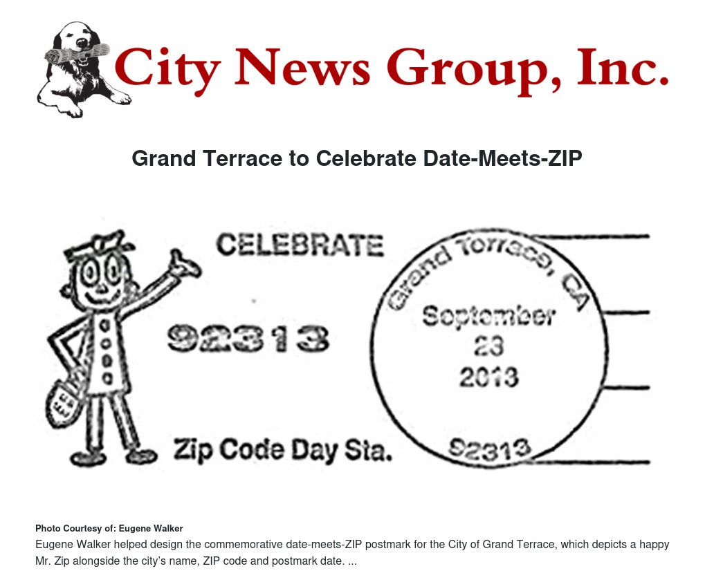 He wanted to create a commemorative postmark and then have the postmark advertised in the Postal Bulletin, a weekly newsletter featuring postal-centric news, procedures, policies and other information to alert other stamp collectors and any others interested of the event. He also helped create the Grand Terrace date-meets-ZIP postmark, which depicts Mr. ZIP next to the city’s name and the date spelled out in full: September 23, 2013.