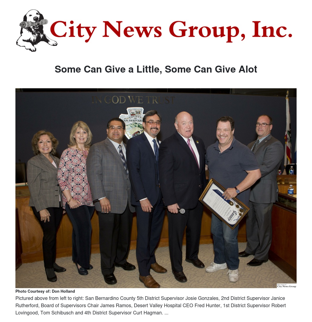 On Tuesday, April 6, the San Bernardino County Board of Supervisors honored Schibusch and Desert Valley Hospital CEO Fred Hunter for their work with the March of Dimes.