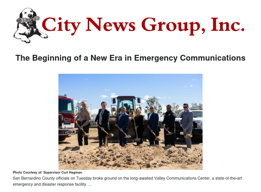 On March 19, San Bernardino County Officials broke ground on a three-story, 75,000-square-foot Valley Communications Center in San Bernardino. The County celebrates the beginning of a new era in emergency communications. The San Bernardino County Office of Emergency Services, Consolidated Fire Agencies (CONFIRE), the Inland Counties Emergency Management Agency (ICEMA), and members of the San Bernardino County Sheriff's Department will all be housed in this cutting-edge, earthquake-resistant, self-sufficient building.