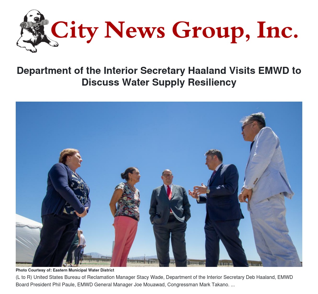 “EMWD sincerely appreciates the time and engagement that Secretary Haaland provided to learn about our Purified Water Replenishment program and the impact that federal funding has on local water supply investments,” EMWD Board President Phil Paule said. “Because of the support of agencies like the Department of the Interior and USBR, and programs like the Bipartisan Infrastructure Law, we are able to return our constituents’ tax dollars back into their communities to invest in programs that provide a direct benefit to their quality of life.”