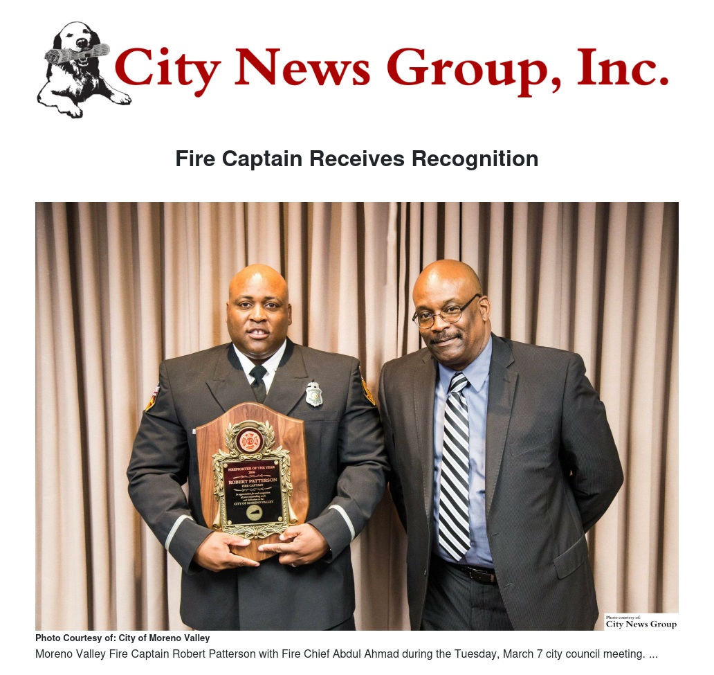 MORENO VALLEY>> During the Tuesday, March 7 city council meeting, Fire Captain Robert Patterson was named as the City of Moreno Valley’s 2016 Firefighter of the Year for his devotion to the community and his passion for helping develop the firefighters of the future.