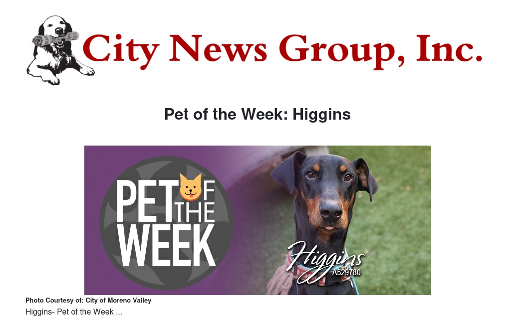 Our Pet of the Week is Higgins, a four-year-old black and brown Doberman Pinscher. Higgins is curious, attentive, and absolutely loves squeaky toys! He is comfortable on a leash and would be a great walking partner on one of Moreno Valley's many beautiful trails.