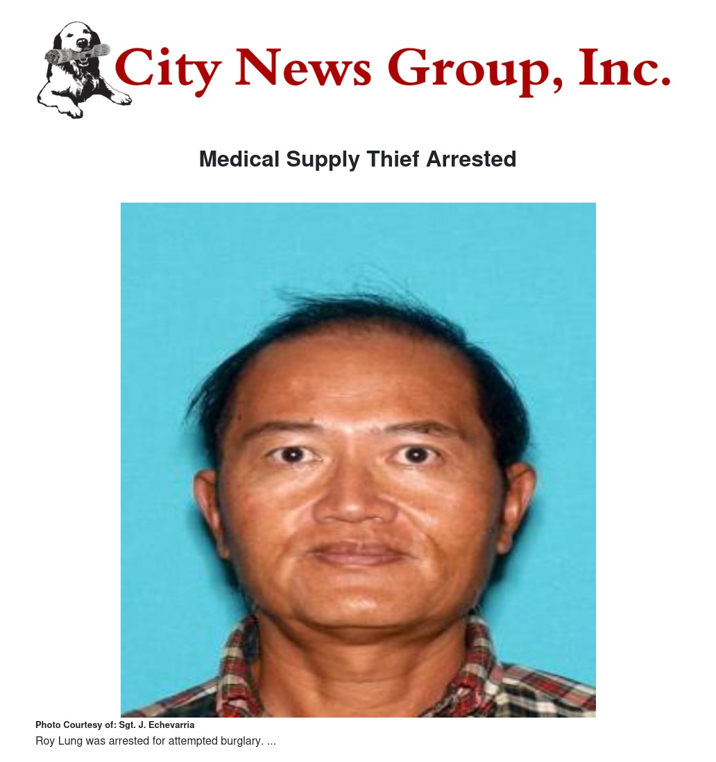 On 01/07/2021, security staff at St. Bernardine Hospital filed a report and were able to positively identify Lung as being the same suspect that committed the previous theft from the hospital. San Bernardino District Crimes Detectives were able to work closely with security at the hospital in order to obtain an arrest warrant for Lung.
