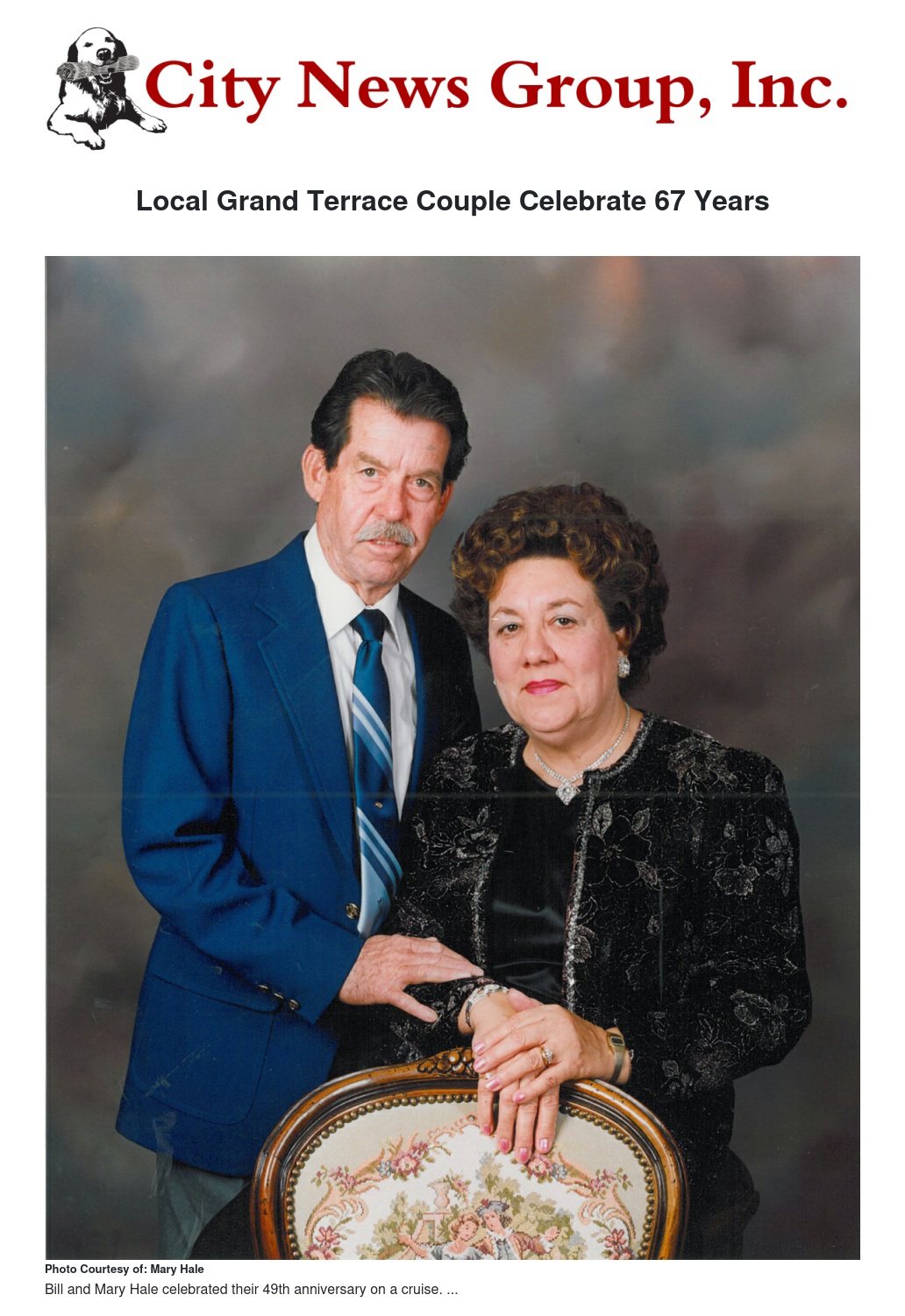 Bill and Mary Hale will be celebrating their 67th anniversary on Nov. 14. They were married in Omaha, Nebraska. Bill was stationed at Offutt Air Force Base and Mary worked for Northwestern Belle Telephone Company. After he got out of service, they moved to California where he was from. Bill was a general building contractor and Mary continued to work as a telephone operator for 10 years. They had 2 sons, David Hale of Grand Terrace and Brad Hale, deceased. They have 5 grandchildren and 13 great grandchildren. They have been living in Grand Terrace for 57 years and counting.