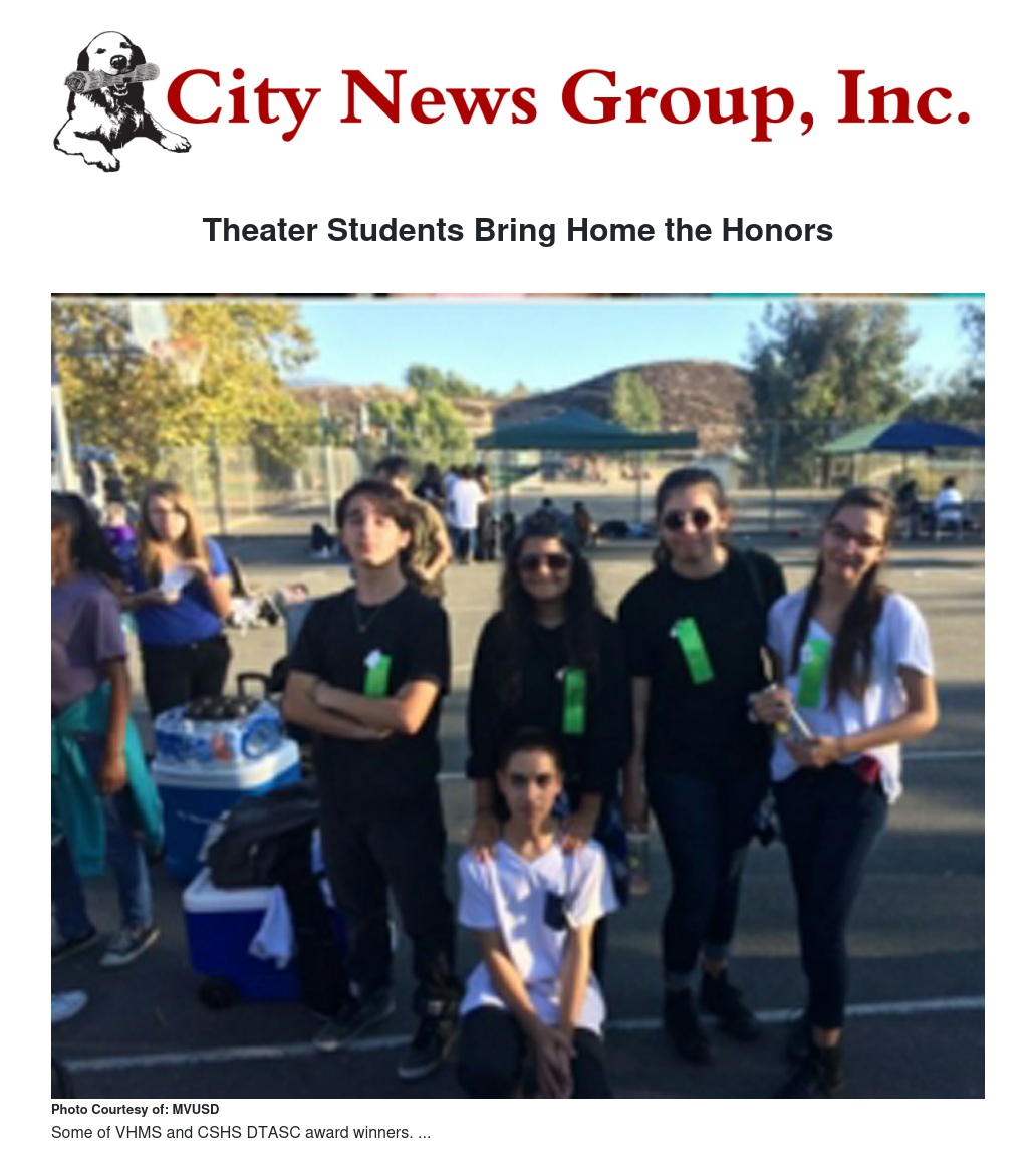 You may have recently heard about the thespians from Valley View High School who won awards at the Drama Teachers Association of Southern California (DTASC) fall festival; you should also know about the thespians from Vista Heights Middle and Canyon Springs High schools who also competed and fared quite well at DTASC, also bringing home ribbons and trophies.