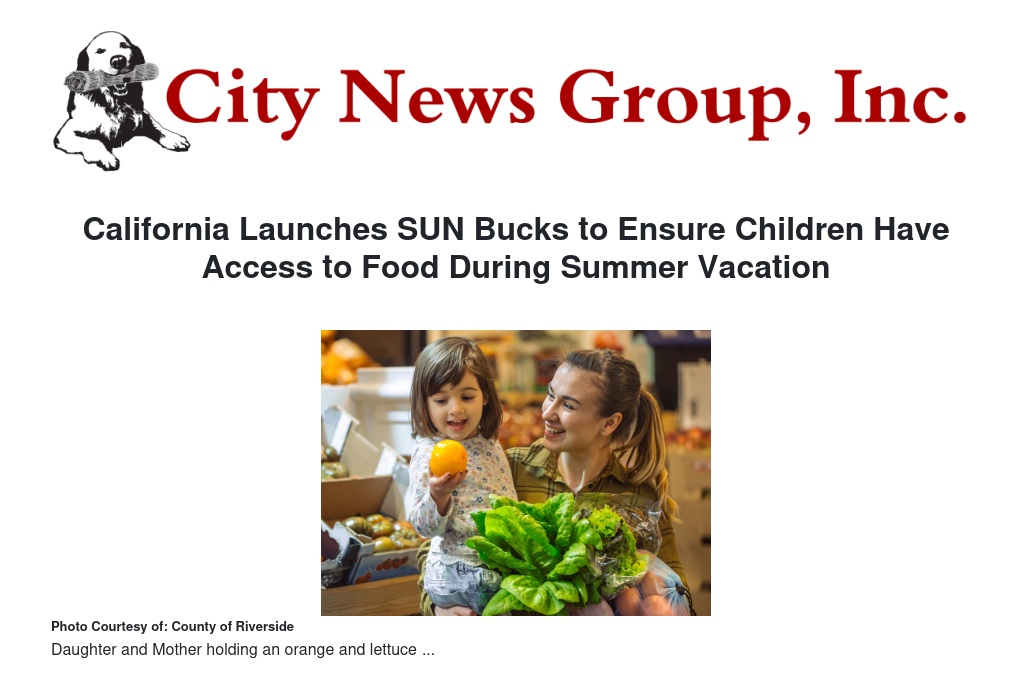 California Launches SUN Bucks to Ensure Children Have Access to Food During Summer Vacation by Stella Pierce - City News Group, Inc.