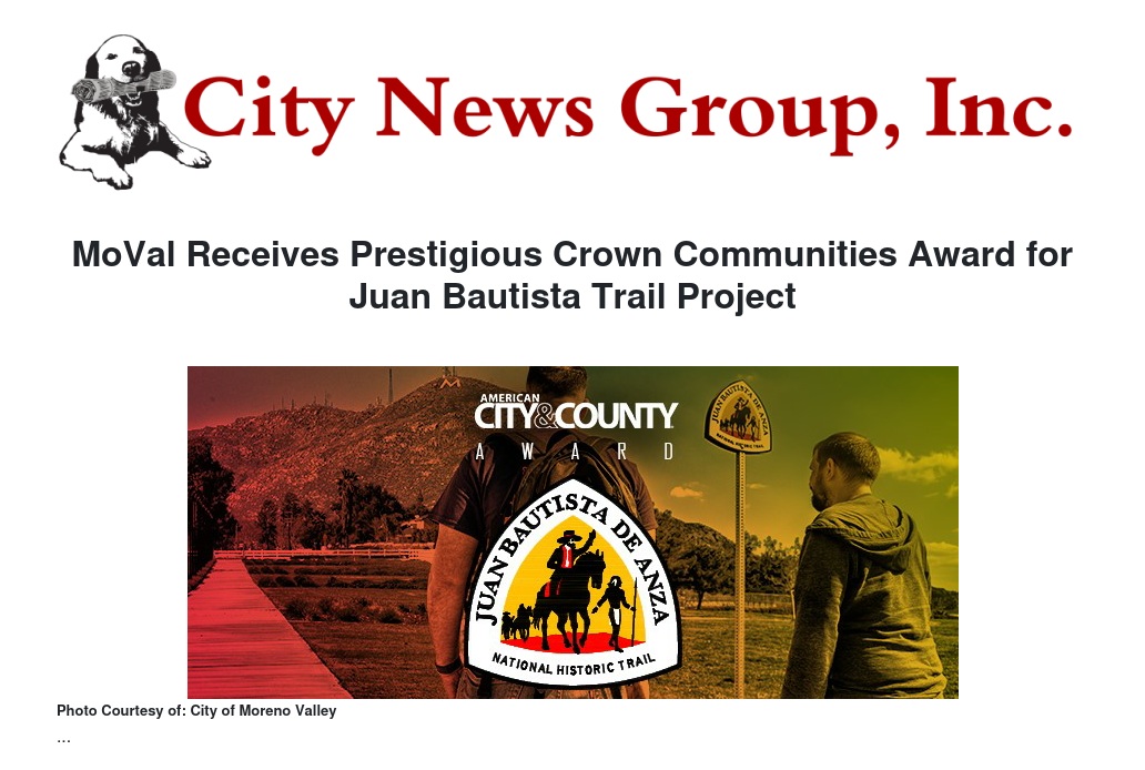 The City of Moreno Valley was awarded the prestigious 2023 Crown Communities Award by American City & County for its Juan Bautista de Anza Multi-Use Trail Project.
