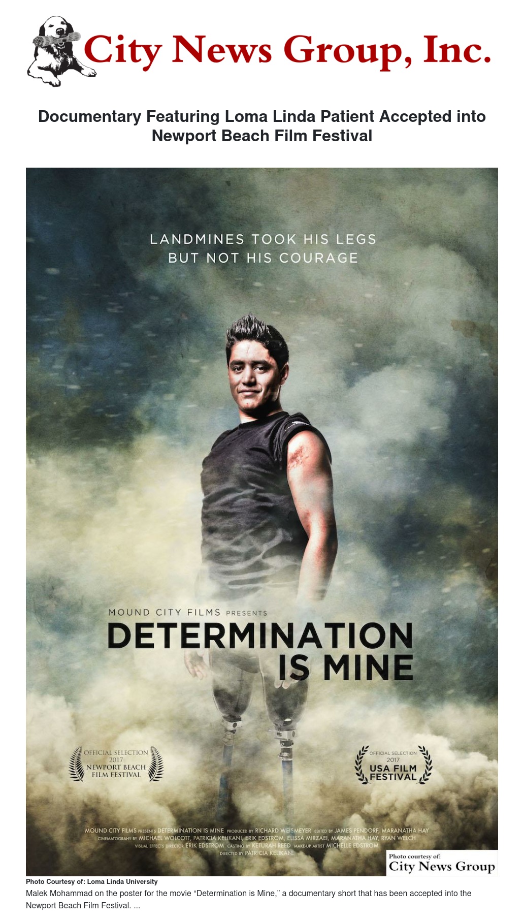 Loma Linda>> “Determination is Mine,” a documentary short about one Afghan boy’s journey to one day walk again after losing both his legs from stepping on a landmine, has been accepted into the Newport Beach Film Festival. The film features a team of Loma Linda University Health clinicians dedicated to the care of Malek Mohammad.