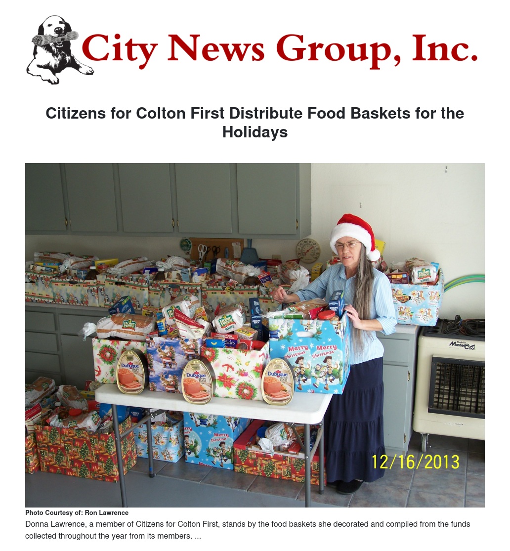 Citizens for Colton First completed their annual food basket distributions for the Christmas holiday. Twenty baskets were completed and given to four Colton schools, a local church and people known to be in need. The funds to fill these baskets were collected throughout the year from the group’s active members and visitors to their meetings. A game called “Happy bucks/Sad bucks” was used to elicit donations. A container is passed around the room and anyone can tell why they are happy or sad and then deposit a dollar or more for each comment, in the container. Donations to different schools were to allow the widest distribution of food baskets available.