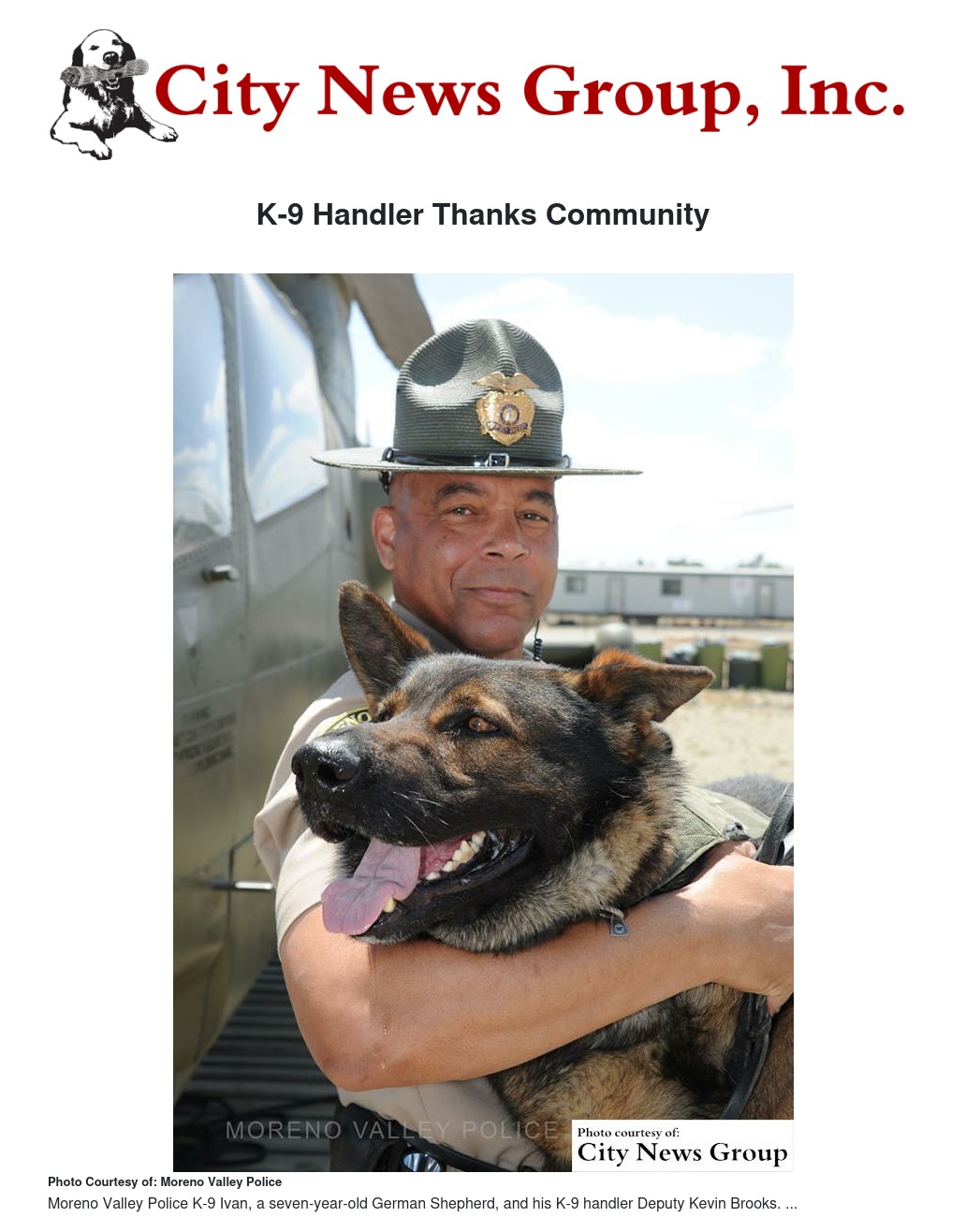 A news release from the City states Ivan was born in Croatia on May 22, 2009, and was brought to the United States to be trained as a police service K-9. In November 2011, Ivan finished his training and was assigned to Brooks at the Moreno Valley Station.