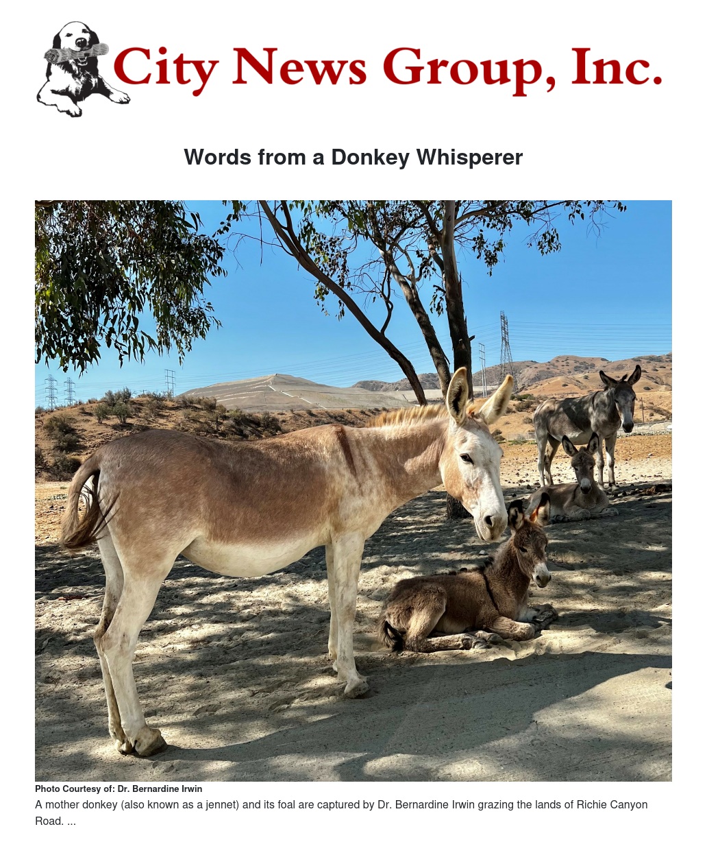 Here in the Inland Empire- especially in the cities of Moreno Valley, Colton, and Loma Linda- with the increasing drought, donkeys began entering our cities in search of water. Beginning last year, they were labeled as a major nuisance. At one of the Loma Linda City Council meetings, a citizen emphasized her frustration by picking up donkey excrement from her yard, bagging it, and then placing the bags on the desk in front of City Council Members. Some found this horrific; others found it humorous. Nonetheless, it definitely got the attention of each City Council Member. One member disparaged the fact that it is against the law to shoot and kill donkeys.